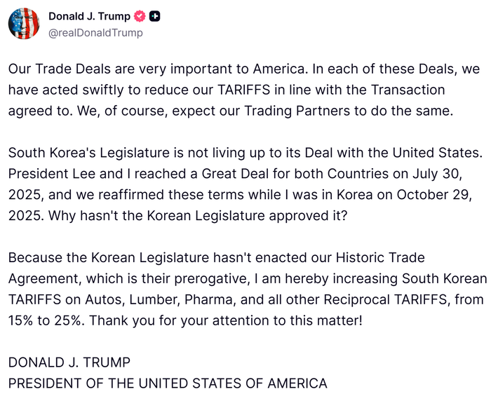 2026.01.27 트럼프 “한국산 자동차·상호관세 15%에서 25%로 인상”